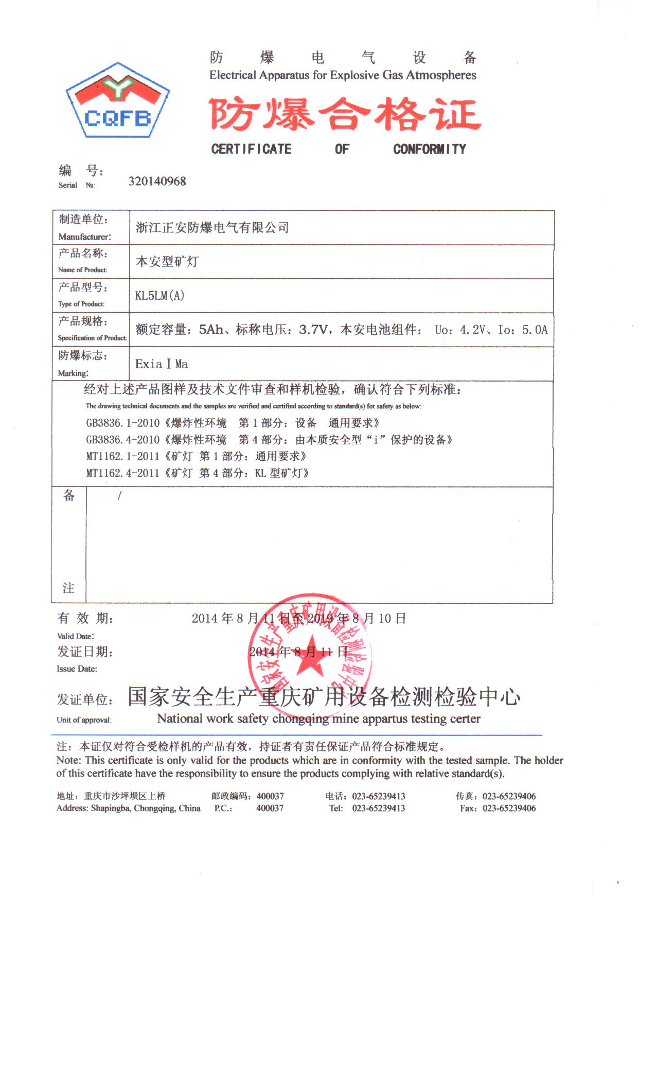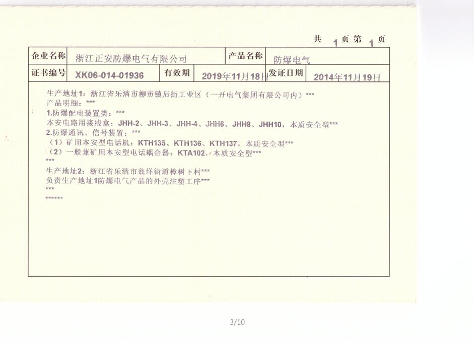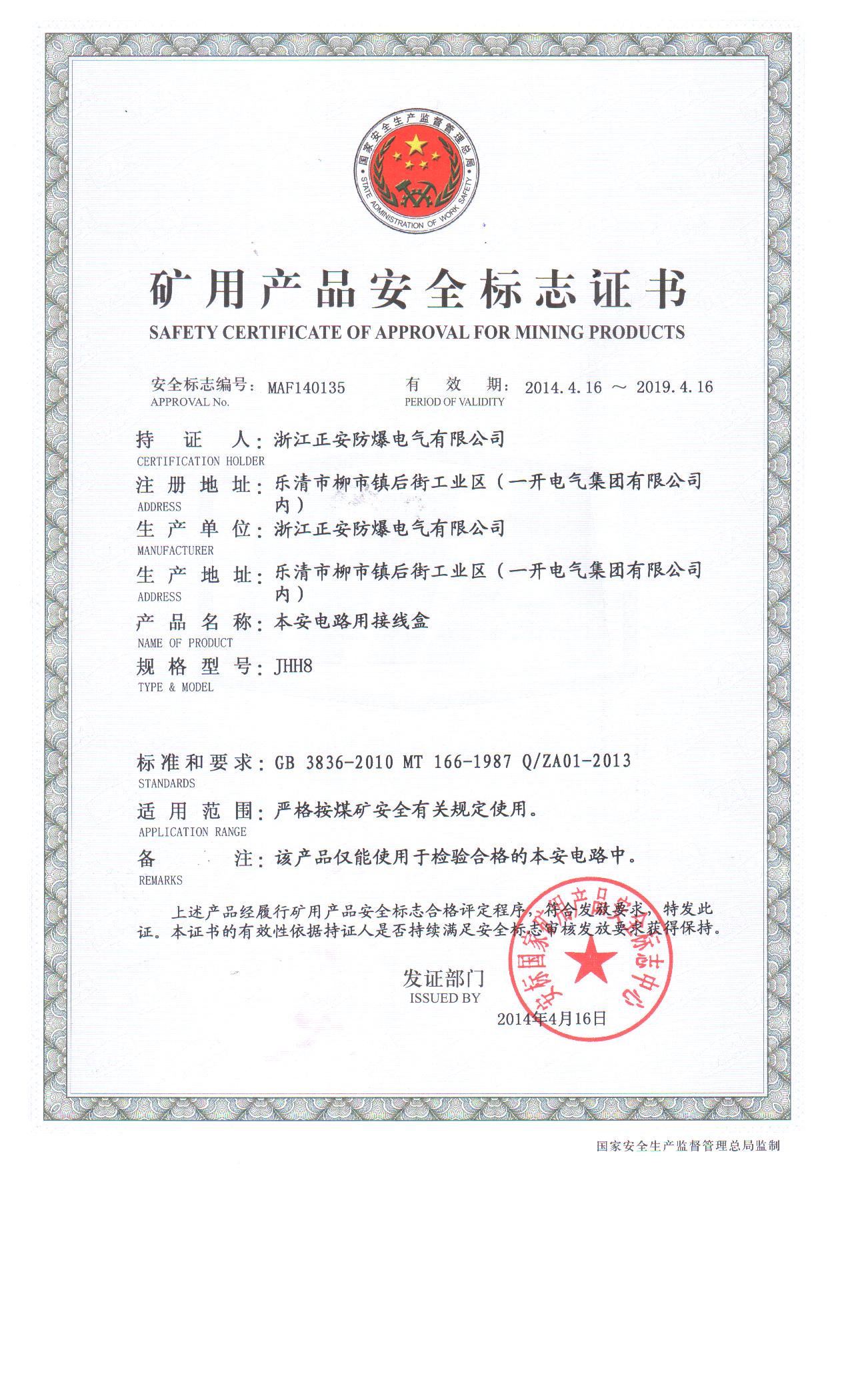 JHH8礦用產(chǎn)品安全標(biāo)志證書