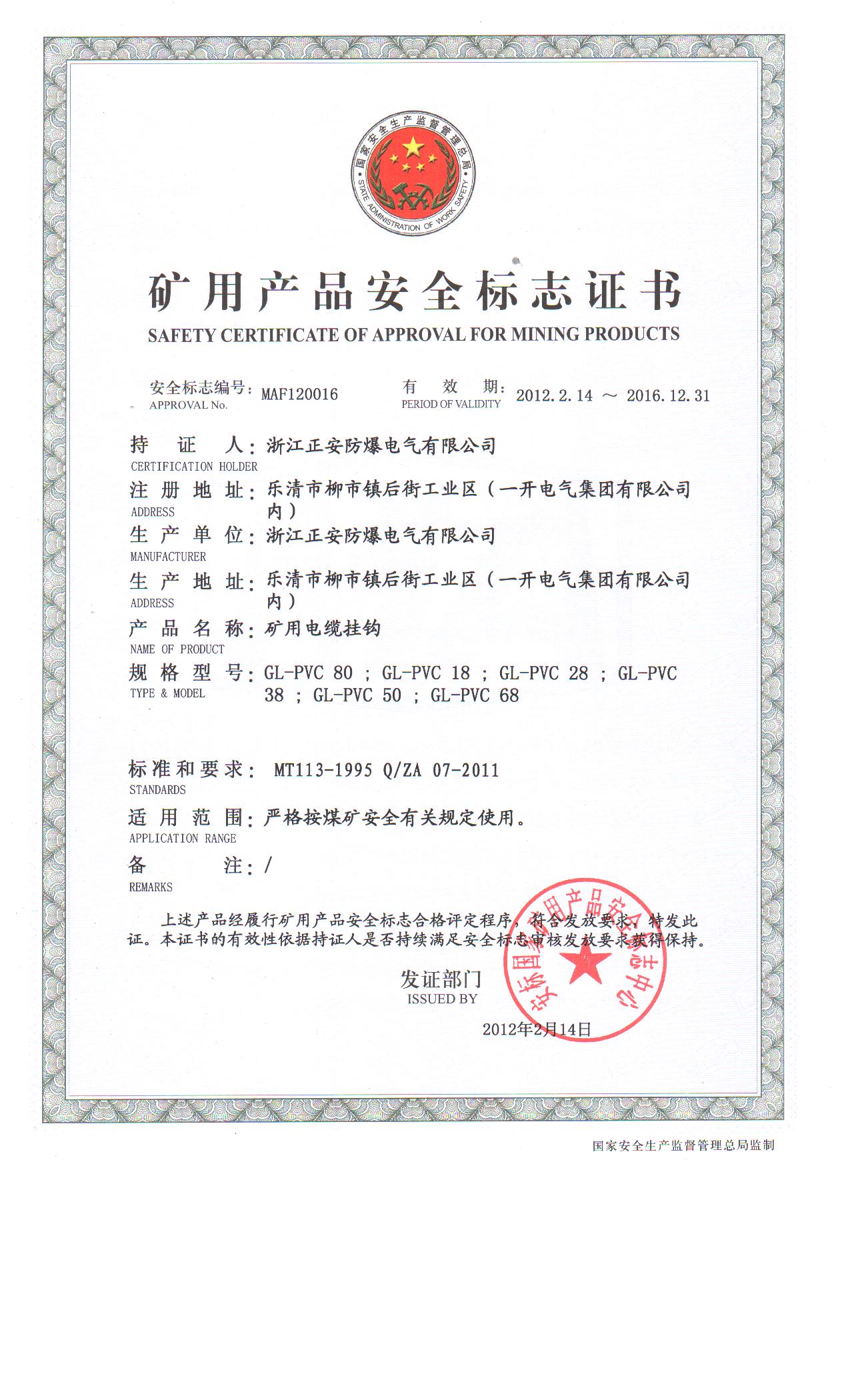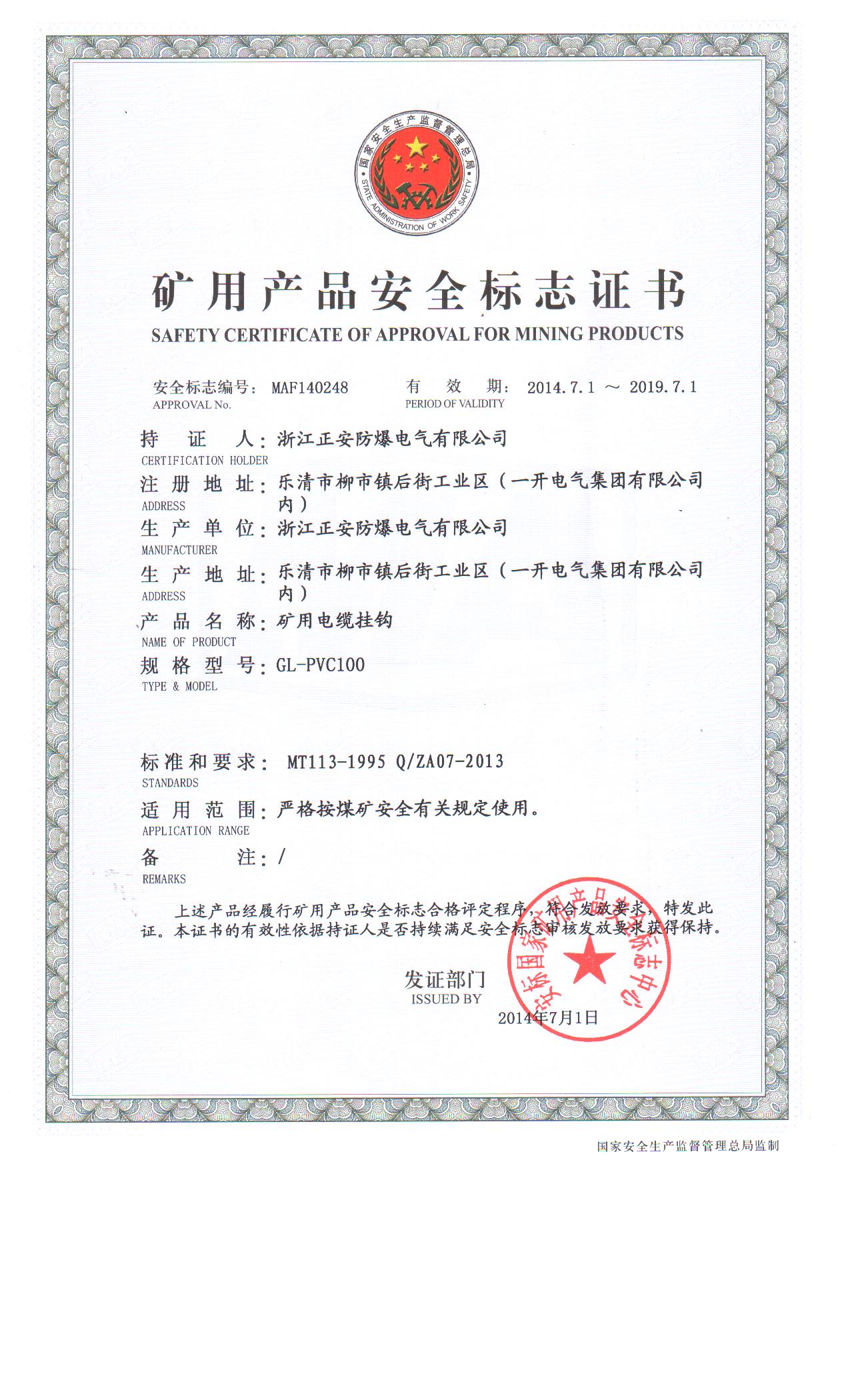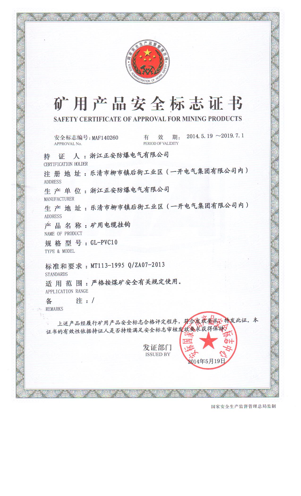 GL-PVC10安標(biāo)證