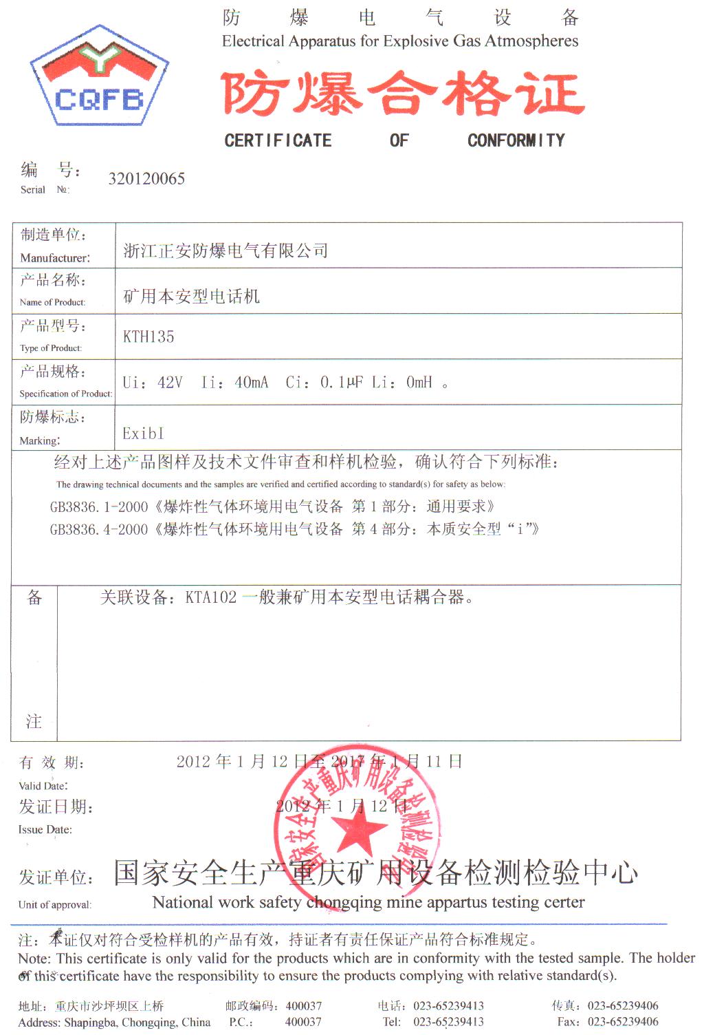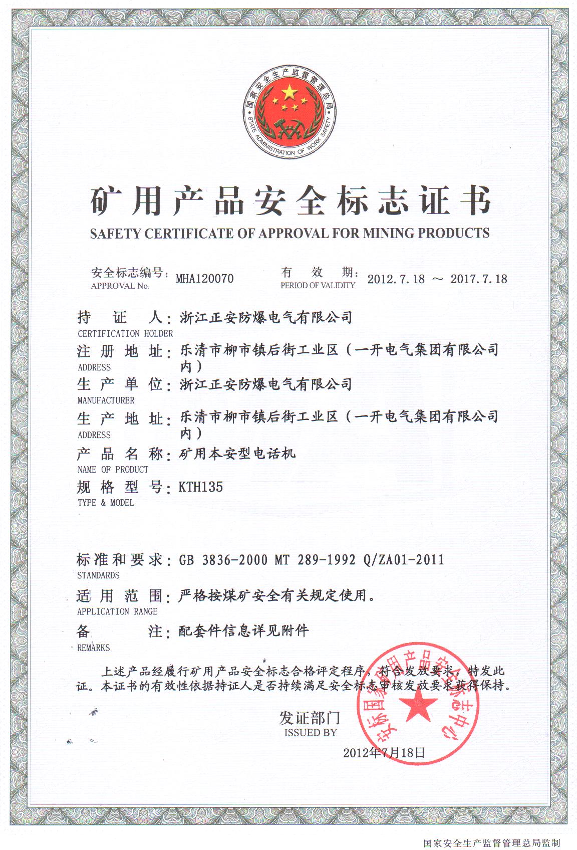 KTH135安標(biāo)證