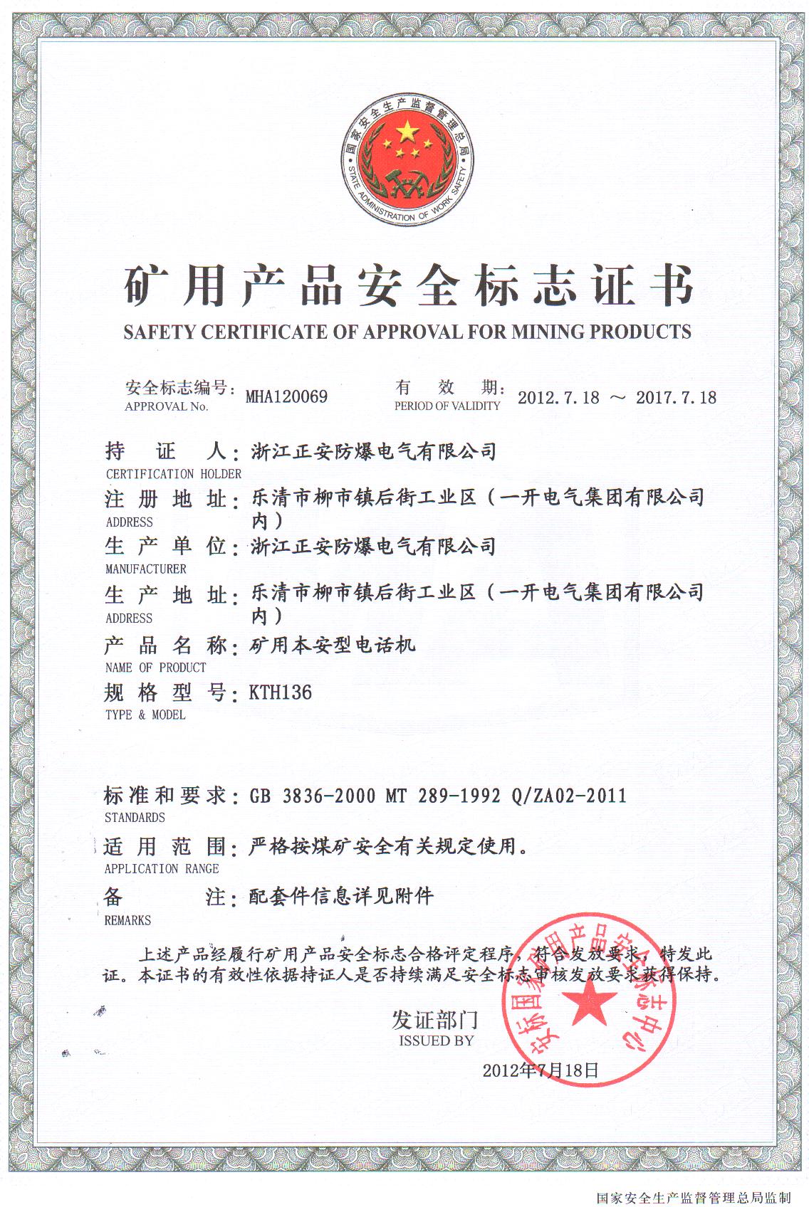 KTH136安標(biāo)證