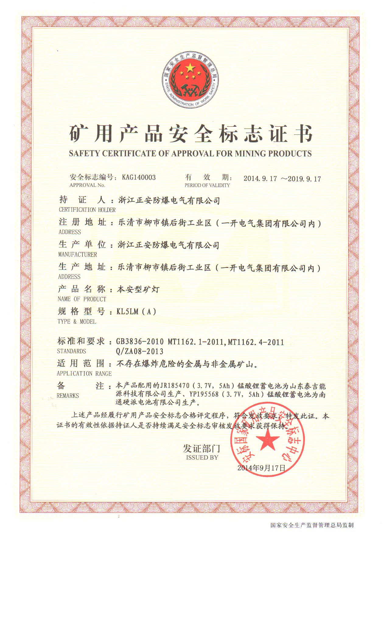 DGS18L安標(biāo)證